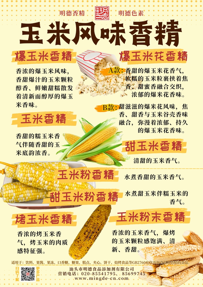 汕頭市明德食品添加劑有限公司推出的玉米風(fēng)味香精系列,覆蓋爆玉米、爆玉米花、烤玉米、糯玉米、甜玉米及粉末型等多種調(diào)性。產(chǎn)品風(fēng)味真實(shí)、留香穩(wěn)定,適用于飲品、烘焙、休閑零食、糖果及復(fù)合調(diào)味等B端應(yīng)用,幫助工廠快速打造具有記憶點(diǎn)的玉米風(fēng)味。